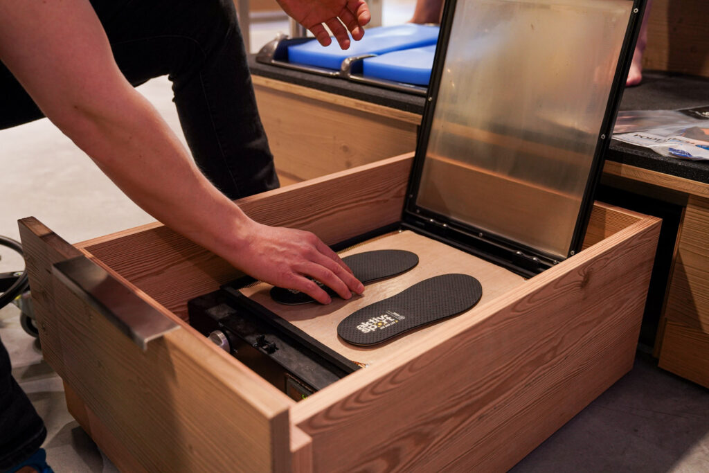 1. Für die Fertigung der Podiatec-Einlegesohlen wird zunächst ein Abdruck Deiner Füße in Neutralstellung in einem Silikon-Sand-Kissen angefertigt. Für die Verformbarkeit des Rohlings wird währenddessen die Sohle erhitzt.