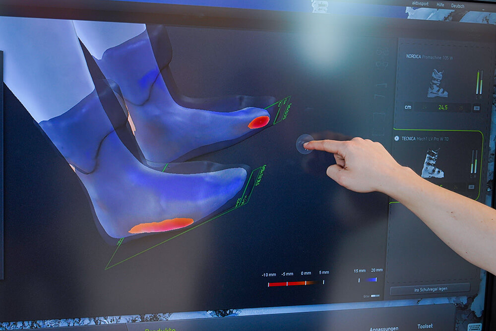 Damit wir die passenden Skischuhe auswählen können, führen wir mit Dir anschließend eine virtuelle Skischuhanprobe durch. Der Scan dient uns auch als Grundlage für spätere eventuelle Anpassungen. Wenn Du nach dem ersten Fahren merkst, dass es doch noch irgendwo zwickt, komm einfach noch mal bei uns vorbei und wir passen den Schuh nachträglich an. Entscheide Dich für mehr Spaß beim Skifahren, indem Deine Skischuhe und Füße zu einer bequemen Einheit verschmelzen.